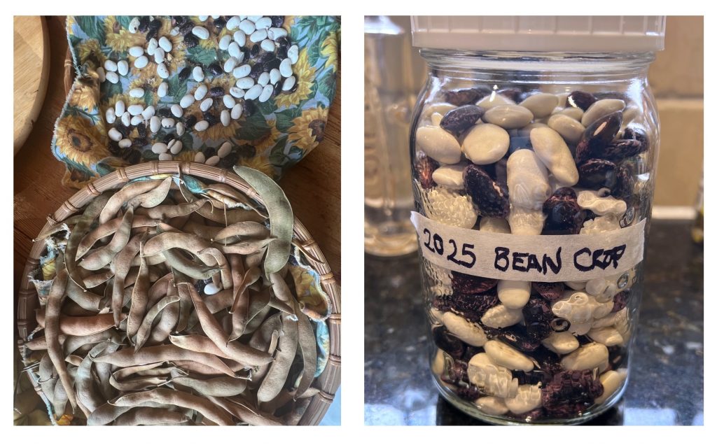 2025 was the exact opposite. Following a wet spring, Ottawa experienced significant drought conditions from June to mid October 2025, with serious impacts on crops and water supplies. I went back to hauling water. By late September, parts of Eastern Ontario, including Ottawa, were under Extreme Drought (D3) conditiona. Despite rather summery conditions, we had a dip in sudden dip temperature around September 20th. A light frost is not usually a problem because humidity will freeze outside the leaves, which can protect the plant. But because we were in a drought with extrewmely low humidity, the cold temperatures froze the water within the plant cells causing what is known as a dry frost, resulting in extensive crop damage at Maple Hill and beyond. The bean leaves all shrivelle below two feet. I hoped my unriped beans would still be able to mature. But no — I had my worst bean harvest in my four years at the farm — one litre jar of my corona and scarlet runner beans together (Figure 2).